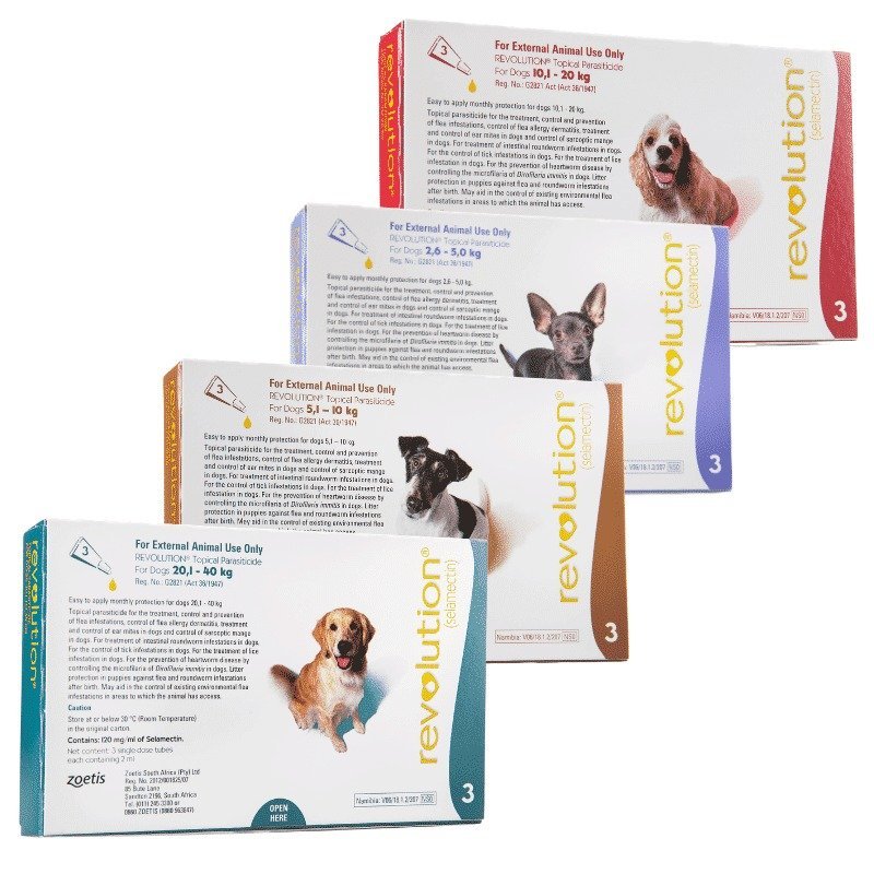 REVOLUTION No matter how big or small, our dogs need our help to protect them from parasites. (selamectin) provides that help. Just one application a month provides protection against fleas and heartworms, treats and controls ear mites and sarcoptic mange, and controls ticks infestations due to American dog ticks. REVOLUTION can treat puppies as young as 6 weeks, and is available in sizes to treat dogs up to 130 lbs with one simple monthly dose.IMPORTANT SAFETY INFORMATION: Do not use REVOLUTION on sick, weak, or underweight dogs. Use only on dogs 6 weeks and older. Prior to administration,
